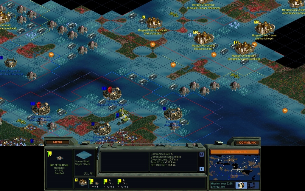 If Morgan would remove the Isles of the Deep from these cities, then I could liquidate them too.  He had a big stack of them in Morgan Construction forever, back when it blocked the only water route northwards.  Now he seems to have spread them out defensively.  Hmm, R-Lasers would kill them.  Especially since Wealth gives him a -1 PLANET rating, making his PSI combat not so good.  However I don't have time to make such units right now.  Maybe he'll do me the favor of finding something better to do with the Isles.  Then I'm in there!