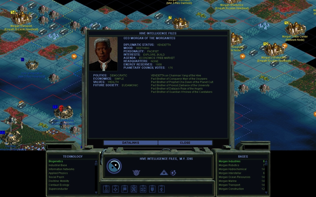 I am the Millenial purveyor of atrocities, with 1101 years of Sanctions against me!  It occurs to me that genetic warfare would be highly effective against Morgan, and would cost me next to nothing.  I have no idea if that can trigger another mindworm apocalypse, as I've never prosecuted a human vs. human genetic campaign before.  It's pretty darned useful for wiping out Aliens, and I know Planet doesn't care about that.  Sadly, I've got some time to wait for this new toy, as my research rate is not particularly fast.  Really Morgan is doing the research now.  That's ok with me, I'm trying to grow larger and win the Governorship.  I'm tantalizingly close to achieving that aim, but it keeps dancing barely out of reach.