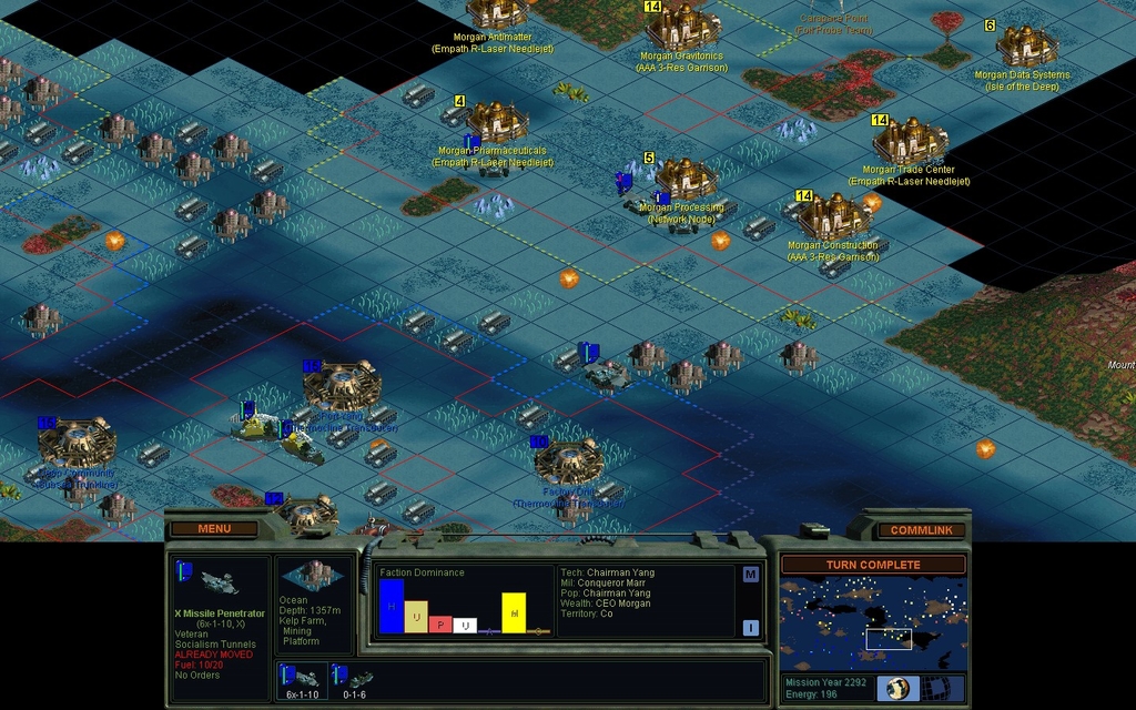 Absent genetic warfare, using X units to depopulate Morgan's major but unimportant cities is probably the key to me gaining the Governorship.  I can't seem to outgrow Morgan because, let's face it, he's pop booming same as I am.  For awhile I didn't understand why he'd be choosing Democratic Simple Wealth Eudaimonic.  Now I realize, Simple gives +1 GROWTH triggering a pop boom with the other options.  He's also only taking -2 POLICE from being Democratic; if he went Free Market, he'd be at -3.  He can't use police, but he doesn't get any penalties for building lots of Needlejets and Copters, nor for moving military units out of his territory.  He must really feel threatened by the Usurpers, to have built so much stuff and still not come after me.  Either that or the AI is just stupid and doesn't know how to fight on water.  Soon I will show him how it's done!