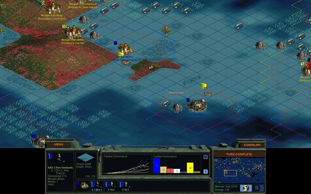 MY 2310.  The Morganites are mildly on the move in my direction.  I see 2 Isles approaching, but for many of my cities, they can't do a thing.  Some cities are vulnerable with only 3 Police Scout units in them, but I don't think the Isles are heading for those, nor do they intend to attack navally.  I think they're trying to dump the ground troops on my land.  There's only 1 place they can do that, that hasn't sunk yet!  It's at the exact center of my empire.  By the time they get there, it might be sunk as well.  And in any event, by then I'll have finally made some combat ships.  A couple of my cities have completed all other growth, minerals, and factory stuff, and are starting on Naval Yards.  I'm not sure how Morgan is doing by comparison, but I almost have a viable sea empire now.  I'm also Unsurpassed on the charts by a healthy margin.