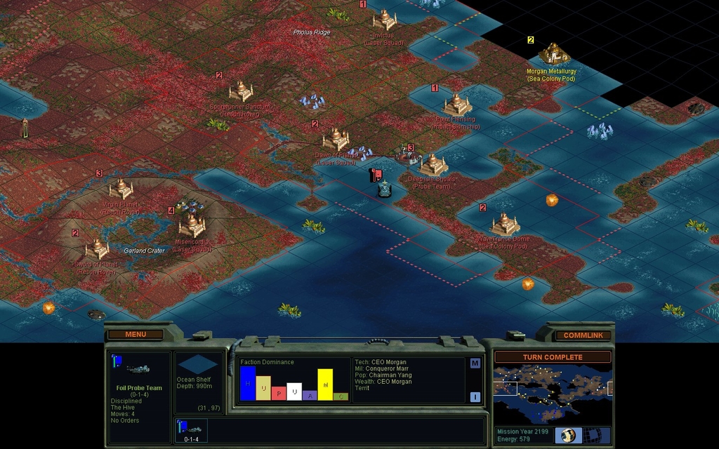 The enemy Foil Probe Team has left its base and is on the prowl again.  The bad news is that means I can't approach his sea base right now, for fear of being captured.  The good news is in a few turns, the sea base should be wide open to extermination.