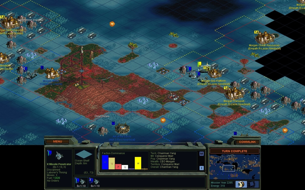 MY 2318.  Morgan let me sneak past him yet again, although I did have to back off once because of an Isle tromping around.  In contrast, when a Cha Dawn transport saw me in Morgan's waters, he actually threw a Conventional Missile at it to get rid of it!  Thanks for reminding me you're nuclear capable, Cha.  I really didn't expect you to be alive this long, or to ever amount to anything.  My earliest atrocities were against the Cultists, so I need to watch my nuclear back with them too.  They have 1 Planet Buster in production, but it will take 20 turns to complete.