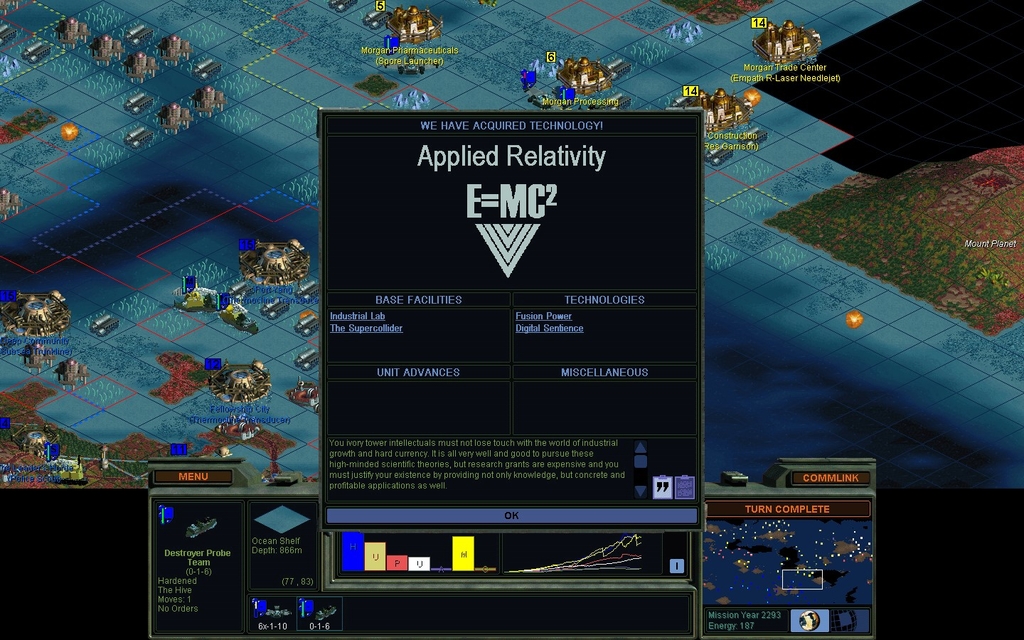 MY 2292.  Morgan has researched Applied Relativity.  Of course I want to steal it.  To that end, I'm performing a weakening operation against his nearest cities.  While keeping him busy, the actual goal is to sneak my Cruiser Probe Team into the middle city.  My X Needlejets might get destroyed, but that's ok.  They're no use to me if they're not being used in combat and making cities disappear.  Soon I will be able to make more of them, as I've got a few Genejack Factories and Subsea Trunklines coming online.  I won't make any new chemical units though.  When the old ones are gone, that's it, I'm going clean.  I've got plenty left to go though.