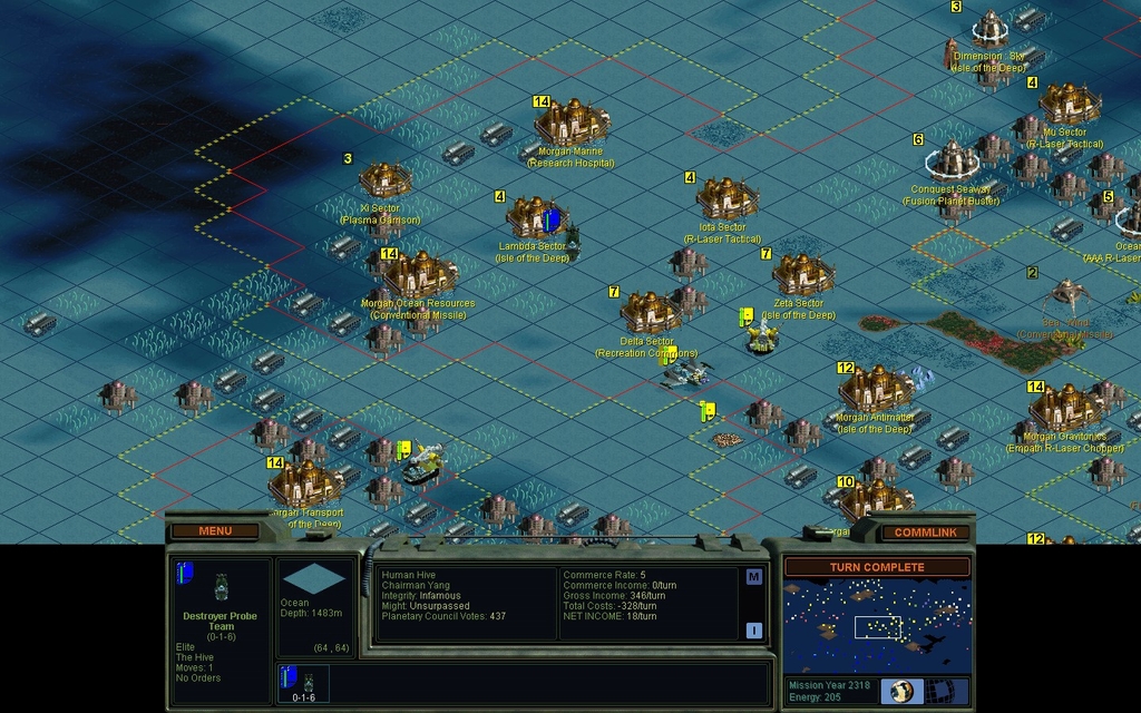 Nah, nah... I will stay the course as Yang.  Actually I'm currently living up to the Build part of his Build, Conquer focus.  All I do is sit around building base improvements and new Fusion garrison troops.  I've got various generations of Sea Formers that are scurrying as fast as they can to create kelp, mines, and tidal harnesses before it all turns into deep ocean.  It's MY 2304 and the pace of notable game events is much slower now.  Morgan is amassing a scary number of military units, I think with an abusive AI Transcend advantage, but they never come for me.  Legitimately, he is at war with the Usurpers, and they have a broad front, so maybe it keeps him busy.  But the AI is also known for being weak at naval combat, not really having a clue about how to project force.  That's actually fine by me, because I think in the mindworm debacle, I already earned winning this game.  It was like, mega-unfair, but I'm still standing (swimming).
