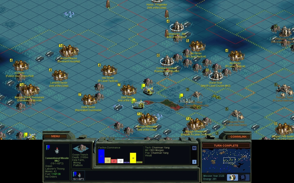 If Morgan would remove the Isles of the Deep from these cities, then I could liquidate them too.  He had a big stack of them in Morgan Construction forever, back when it blocked the only water route northwards.  Now he seems to have spread them out defensively.  Hmm, R-Lasers would kill them.  Especially since Wealth gives him a -1 PLANET rating, making his PSI combat not so good.  However I don't have time to make such units right now.  Maybe he'll do me the favor of finding something better to do with the Isles.  Then I'm in there!