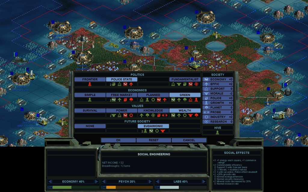 I'm realizing that if I go Planned, I can pop boom!  That's why the Hive has a GROWTH bonus, because he can't go Democratic to complete the necessary conditions for pop booming.  Not all factions were given this capability.  For instance, not the Cultists, who can't go Democratic and thus can't pop boom.  Nor the Usurpers, who can't go Democratic either.  Not Morgan, who can't go Planned although he could go Simple.  And some AI factions won't choose it in practice; for instance, Zhakarov will choose Cybernetic over Eudiamonic.  Roze will insist on Thought Control, not Eudaimonic.  In this game, I'm the only one who's going to pop boom.  Lal and Domai might / should pop boom, but I haven't checked whether they've actually done it.  The Believers could do it, because I also gave them +1 GROWTH, but I don't know if the AI would.