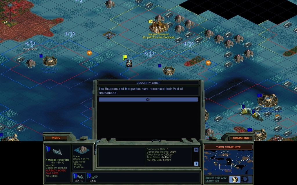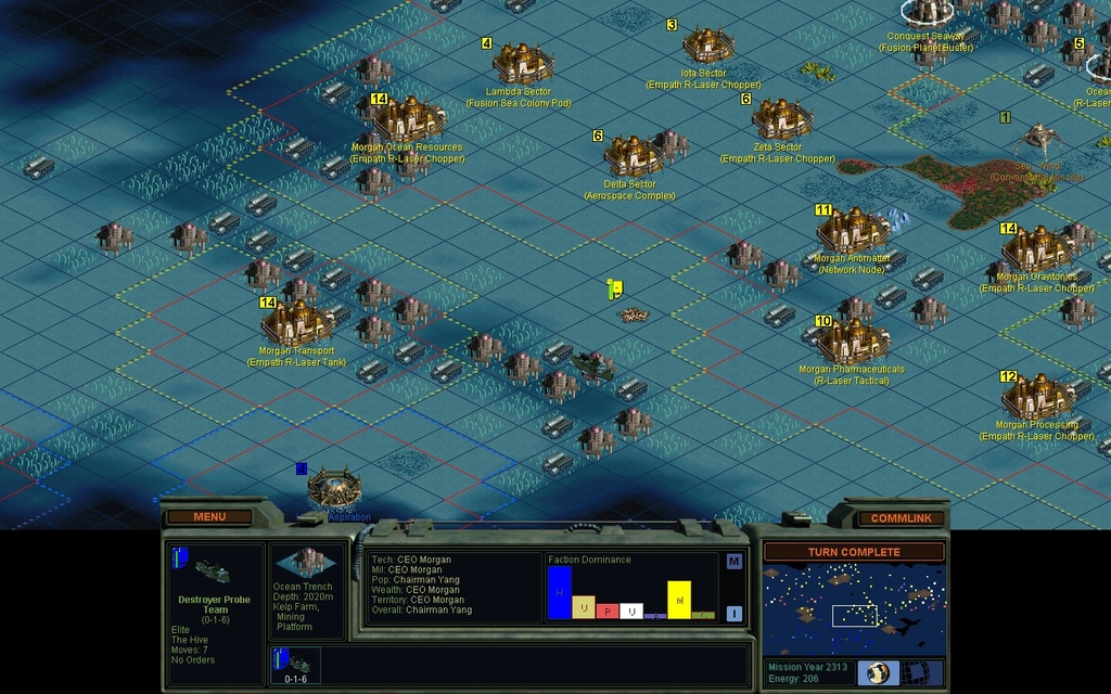 Nah, nah... I will stay the course as Yang.  Actually I'm currently living up to the Build part of his Build, Conquer focus.  All I do is sit around building base improvements and new Fusion garrison troops.  I've got various generations of Sea Formers that are scurrying as fast as they can to create kelp, mines, and tidal harnesses before it all turns into deep ocean.  It's MY 2304 and the pace of notable game events is much slower now.  Morgan is amassing a scary number of military units, I think with an abusive AI Transcend advantage, but they never come for me.  Legitimately, he is at war with the Usurpers, and they have a broad front, so maybe it keeps him busy.  But the AI is also known for being weak at naval combat, not really having a clue about how to project force.  That's actually fine by me, because I think in the mindworm debacle, I already earned winning this game.  It was like, mega-unfair, but I'm still standing (swimming).