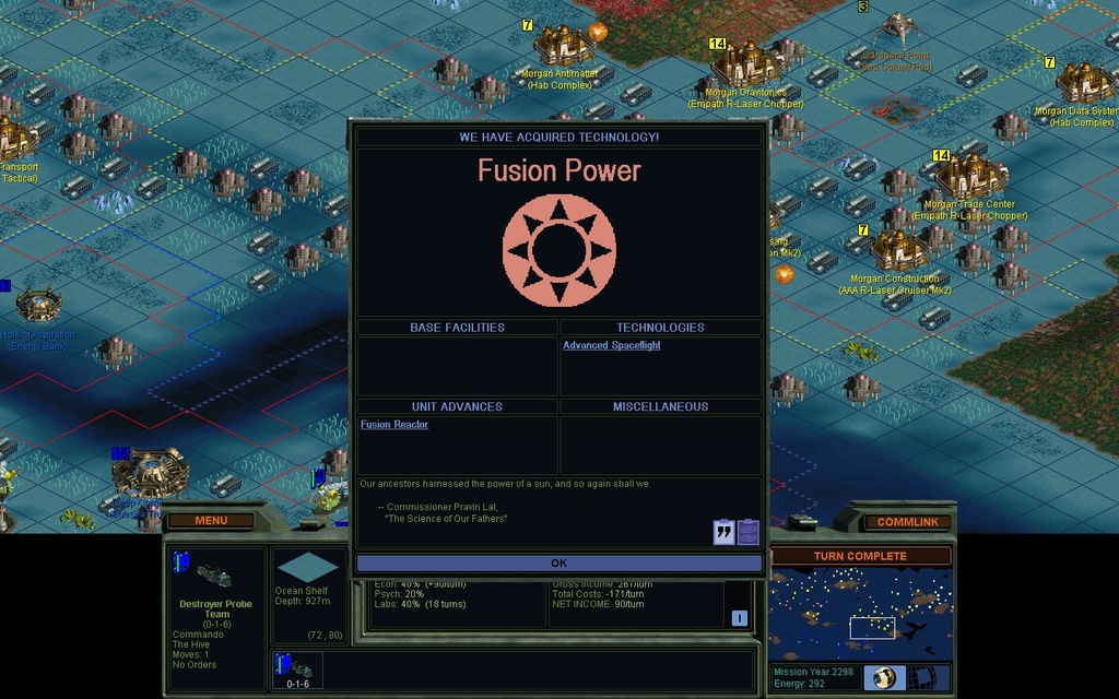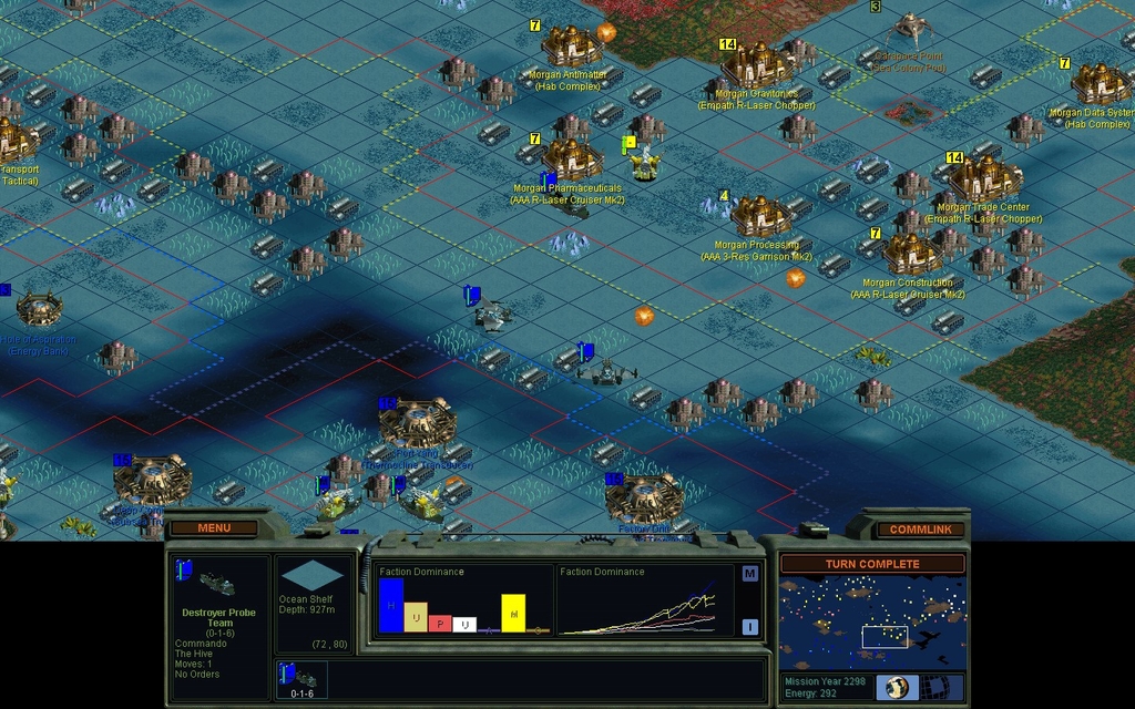 MY 2292.  Morgan has researched Applied Relativity.  Of course I want to steal it.  To that end, I'm performing a weakening operation against his nearest cities.  While keeping him busy, the actual goal is to sneak my Cruiser Probe Team into the middle city.  My X Needlejets might get destroyed, but that's ok.  They're no use to me if they're not being used in combat and making cities disappear.  Soon I will be able to make more of them, as I've got a few Genejack Factories and Subsea Trunklines coming online.  I won't make any new chemical units though.  When the old ones are gone, that's it, I'm going clean.  I've got plenty left to go though.