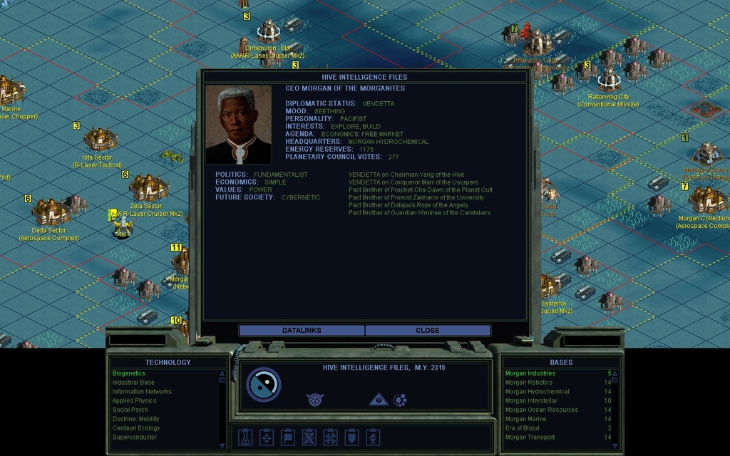 If Morgan would remove the Isles of the Deep from these cities, then I could liquidate them too.  He had a big stack of them in Morgan Construction forever, back when it blocked the only water route northwards.  Now he seems to have spread them out defensively.  Hmm, R-Lasers would kill them.  Especially since Wealth gives him a -1 PLANET rating, making his PSI combat not so good.  However I don't have time to make such units right now.  Maybe he'll do me the favor of finding something better to do with the Isles.  Then I'm in there!