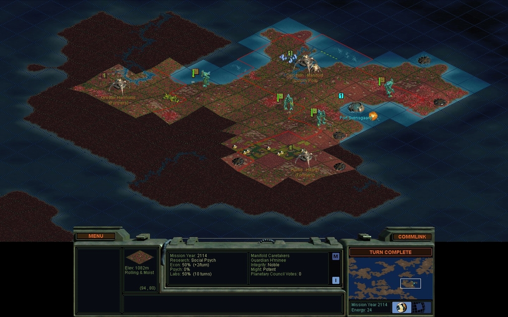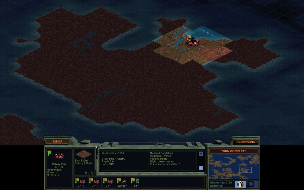 Mission Year 2106.  This island is large enough to build a modest civilization on.  I will want to know if the nearby land masses contain Usurpers or not.  I should get a boat into the water and start poking around for Isles of the Deep to capture.  I often forget to do sea capture when playing a PLANET friendly faction, but I won't forget this time.