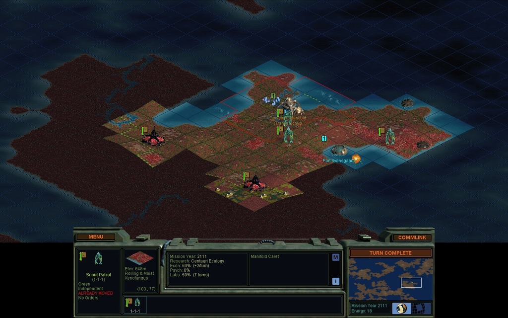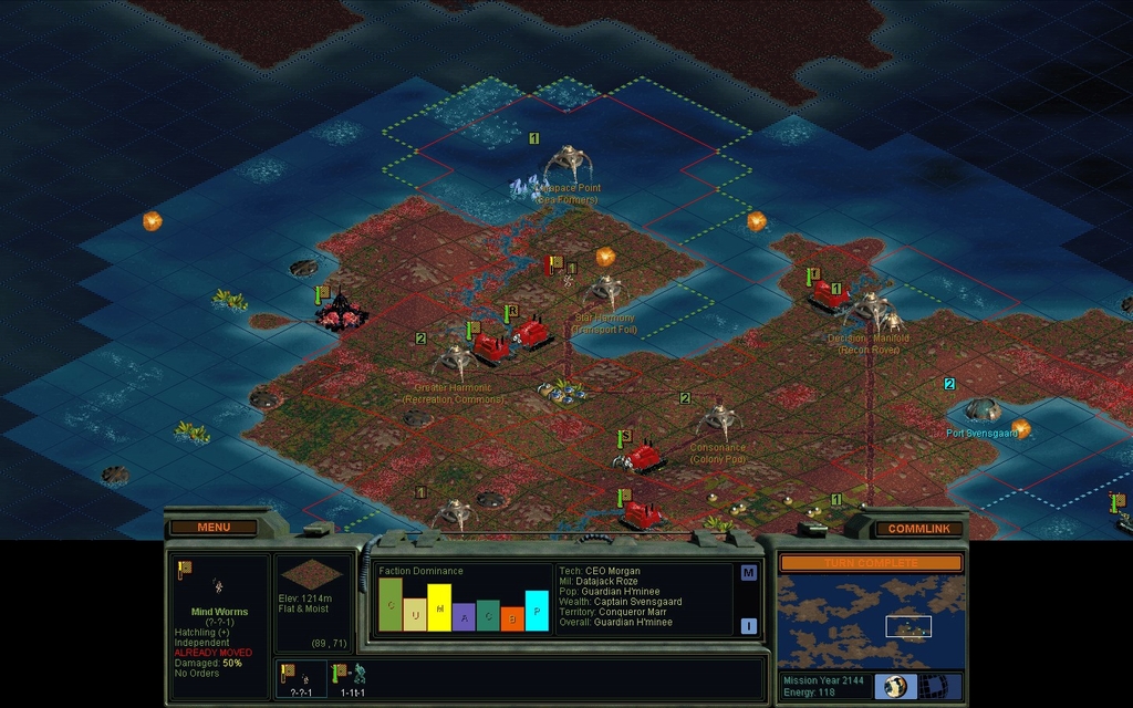 MY 2144.  I finally capture my first mindworm.  I couldn't stir one out of the fungus.  Eventually I popped a pod that had a mindworm in it, killing my first Independent Scout.  This is really behind the curve for a usual PLANET friendly faction start.  Oh well.