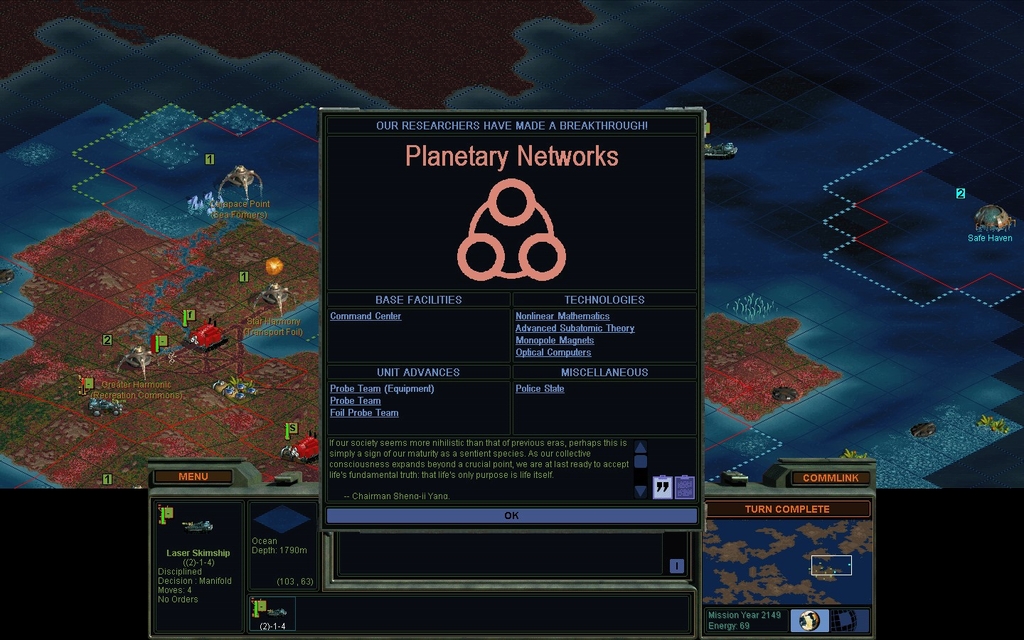 MY 2149.  In my mod, Planetary Networks is how you get Police State, probe teams, and Command Centers.  I'm after the probe teams as my faction cannot use Police State.  I start working on a Foil Probe Team to infiltrate Svensgaard with.  That's a predesigned unit now, so the AI does use them to take over sea bases.