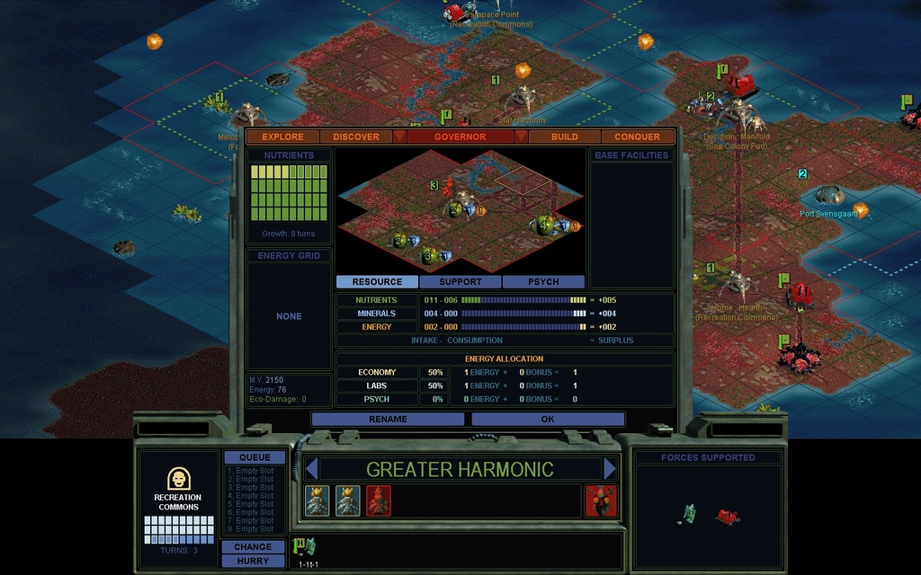 MY 2150.  I have run out of island space to put cities on, so most of my cities have started to build Recreation Commons.  It only costs 30 instead of 40 in my mod.  Hologram Theaters are also cheapened: they only cost 50 and the maintenance is reduced from 3 to 2.  These improvements are new in 1.19, the idea being to make unhappiness less painful and tedious at the beginning of the game.  I didn't change the price of Recycling Tanks though, as I think getting 1 food 1 mineral 1 energy is pretty valuable.
