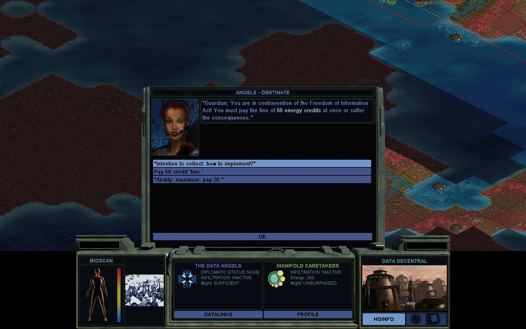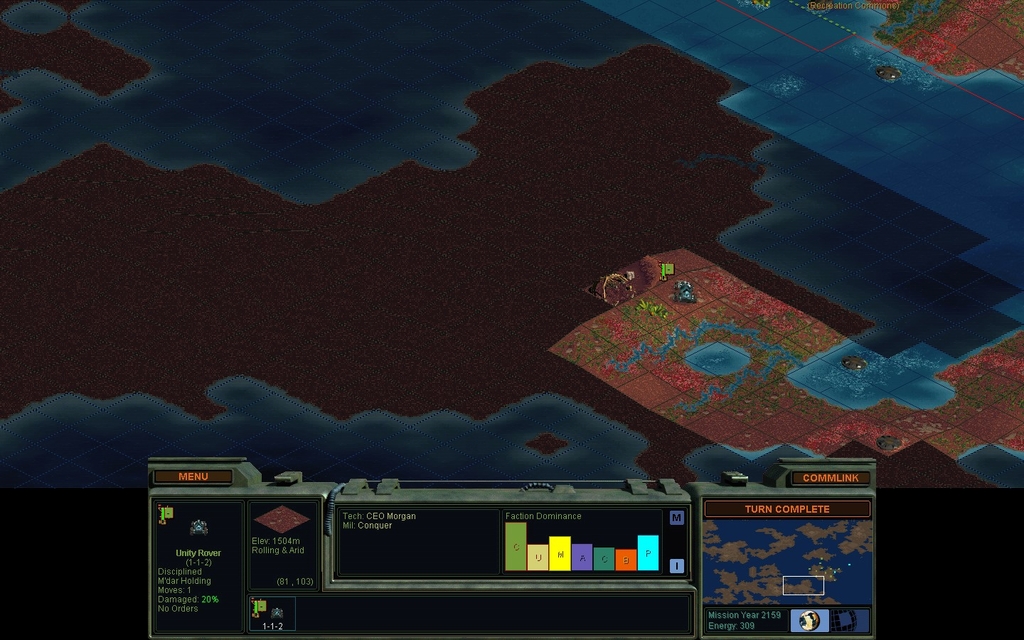Not only has the engine core already been cleaned out, Datajack Roze has got a city sitting on top of the crash site.  She has the temerity to threaten me.  Well I guess I'm going to discover what techs she has to steal, aren't I?  This is a good thing in the short term.  Both Morgan and Svensgaard have techs I want, but I'm not willing to pay for them.  Maybe the new, powerful, all-acquiring Roze has already got them for me.