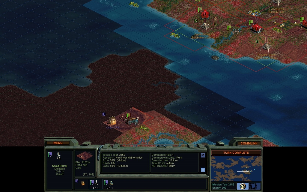 Coder's Pit is a sad little city.  Maybe I can get that Artifact!  Problem is, this is only a Scout Rover and I'm wounded.  I'd better retreat, scout around, and come back with more of an attack force.  Bring a probe team too.  I shouldn't laugh too hard, all of my cities are defended by Scouts too.  I need to change that now.  Well I'll have Nonlinear Mathematics in 4 more years, so my offensive situation is well in hand.  A good offense is the best defense...