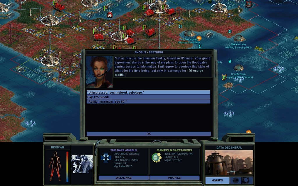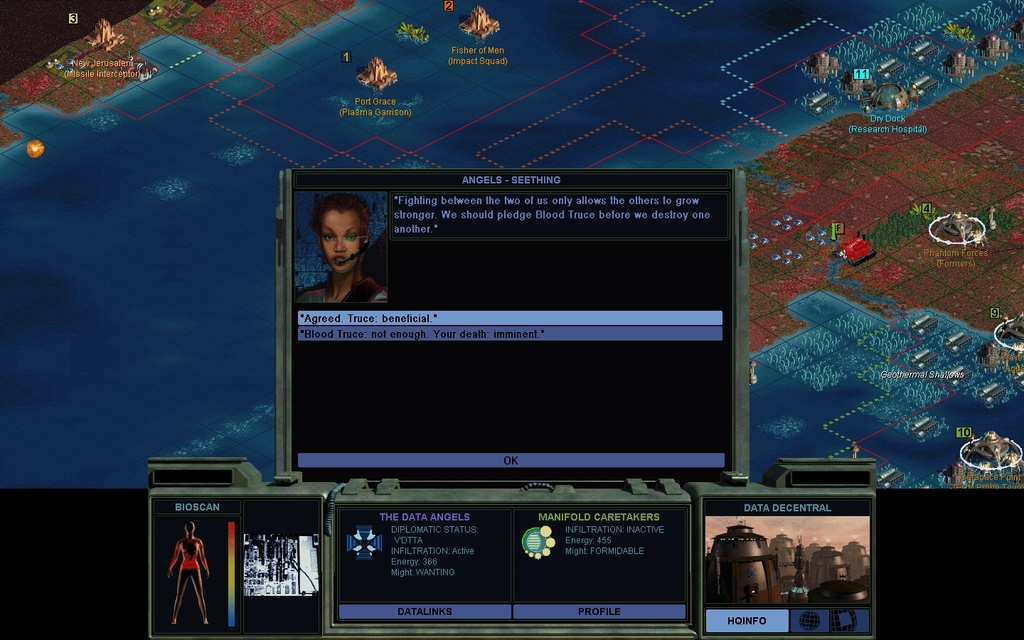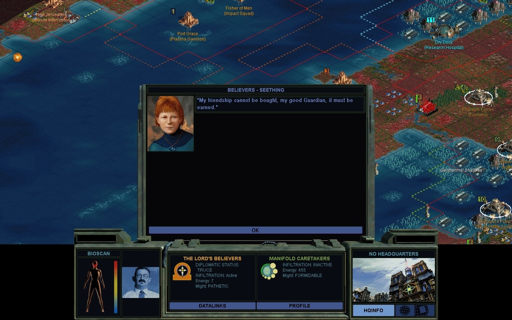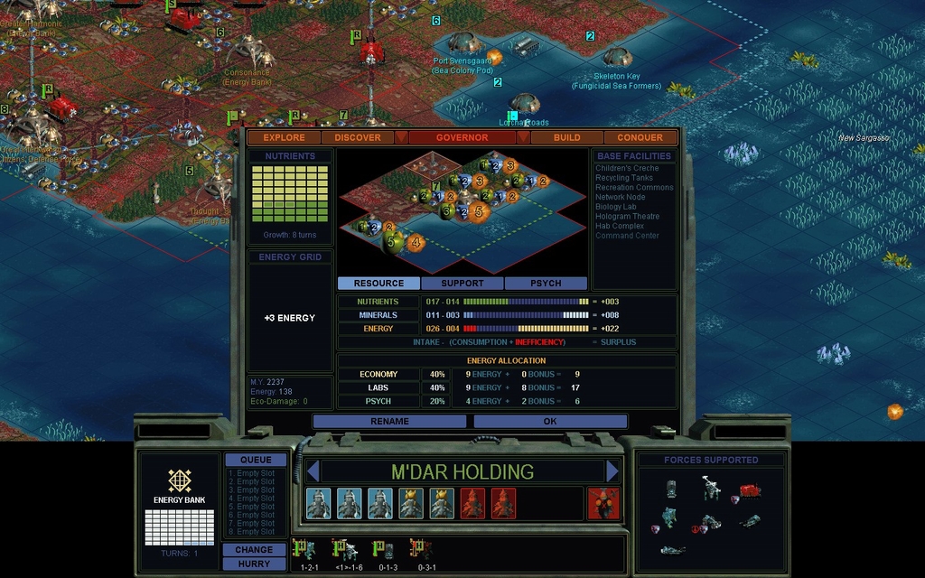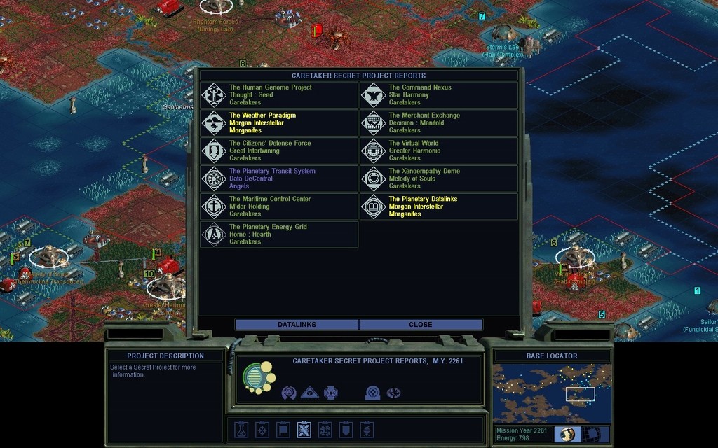 MY 2261.  I complete the Planetary Energy Grid.  After selling my old Energy Banks, I have piles of money.  I'm going to pursue the Ascetic Virtues as it will reduce my POLICE problem.  I think I need to do a land invasion of Marr and really put him out of the game.  I anticipate that nukes will proliferate, but Marr and Miriam are the only Aggressive factions likely to toss a nuke for the hell of it.