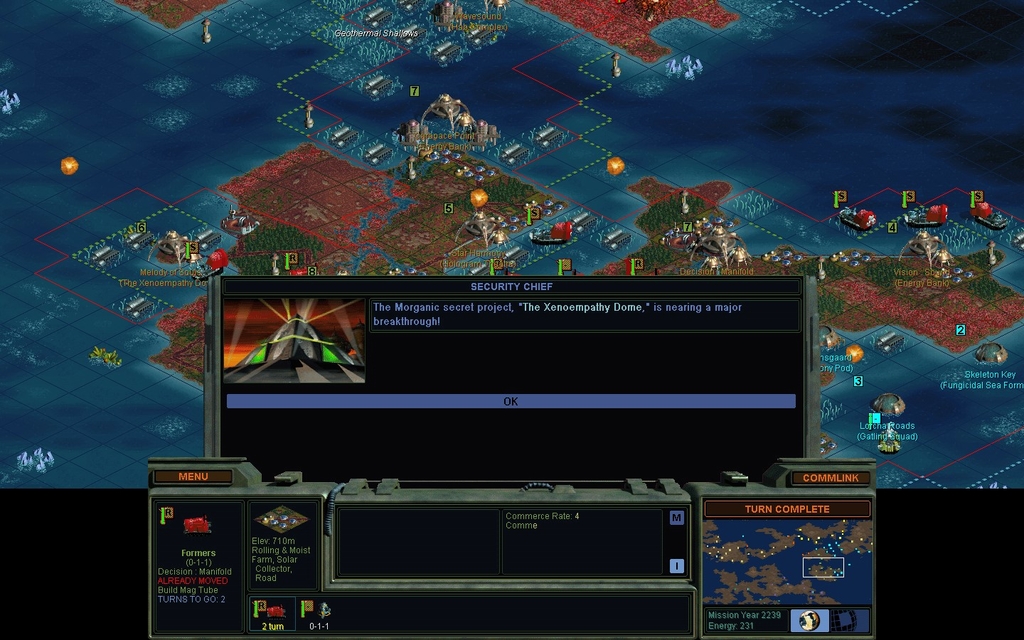 MY 2242.  Using Artifacts, last year I completed the Xenoempathy Dome.  This year I completed the Citizens' Defense Force, completely shutting Morgan out of the Secret Project races.  I am building the Merchant Exchange and the Maritime Control Center unchallenged.  I'm about to steal some more tech from him as well.