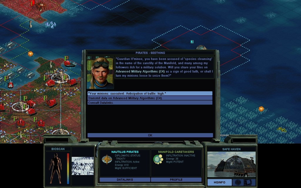 MY 2246.  Svensgaard gets snippy!  Doesn't he realize I've got better weapons than he does?  Including Marines?  And a Maritime Control Center about to be completed?  Oh well, if he wants me to build the Virtual World instead of him, I will.  I was happy enough to leave him alone, as my human shield, but now he's my human problem.
