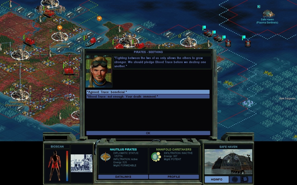 MY 2252.  After stealing everything Svensgaard had, I take Port Svensgaard, nestled snug upon my coast and highly vulnerable to my Marines.  He acquiesces to my Truce, lest he get further whippings.  My only real challenge is getting a probe team in there.  I need to crank out as many Supply Crawlers as possible for awhile, as I've got the Virtual World and the Planetary Energy Grid under production.  The Maritime Control Center is complete though.  Come to think of it, I don't think I ever built a Cruiser.