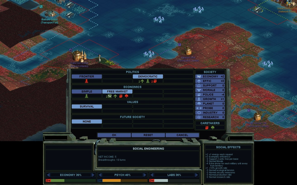 MY 2182.  Time to put a little Democratic in my step!  Giving up police is a hit, but that always happens with Democratic anyways.  I can have 1 military unit per city out in the field before people get upset.  I think I'm going to go Free Market, as my +1 PLANET isn't doing me any mindworm good in the real world.  I've adjusted my budget to 30-40-30 to make people happy in the interim.