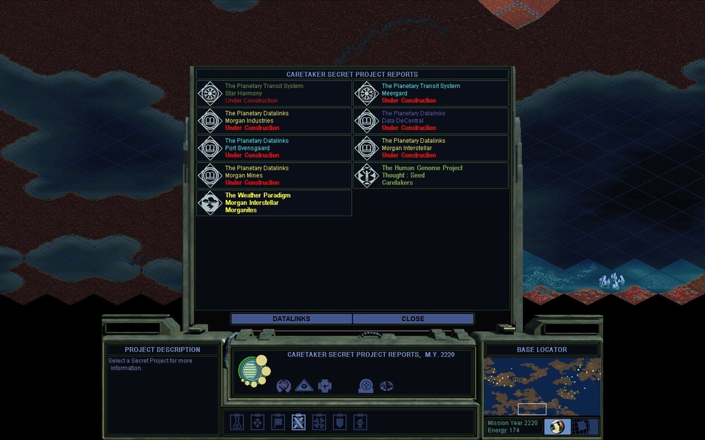 MY 2221.  I steal Advanced Military Algorithms from the Usurpers.  This gives the Command Nexus, so I start to work on that.  The Usurpers aren't working on it, must be too busy fighting.  They keep getting their sea bases taken by other factions though, possibly via Foil Probe Teams.  I haven't been paying much attention.  I know the Usurpers are fighting a land campaign against the Believers and will presumably crush them.  The latter didn't start with any kind of land advantage and they're sharing a large continent with the Usurpers.  That would happen to just about any human faction, I don't think it's an indictment of Believer weakness.  Yes I defanged the Aliens, but directed research is a powerful ability, and the Usurpers are still dangerous.