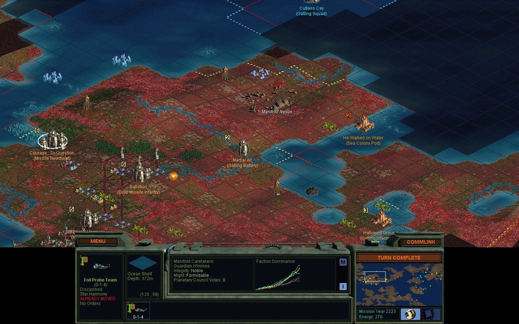 The rest of the politics are uneventful.  Most everyone hates me, but nobody goes to war with me, because they're all at war with each other.  I've got enough Foil Probe Teams to fill an ocean, for lack of anything better to build.  They gradually steal techs from Marr.