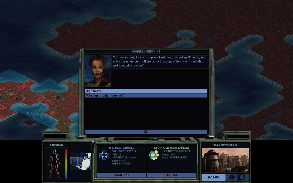 MY 2180.  While trying to pop a coastal pod with a Rover, I run into the Consciousness.  She wants war with Svensgaard.  Am I the only one who doesn't?  Well, Marr's not on his case yet either.  She won't sign a Treaty with me and signs off.