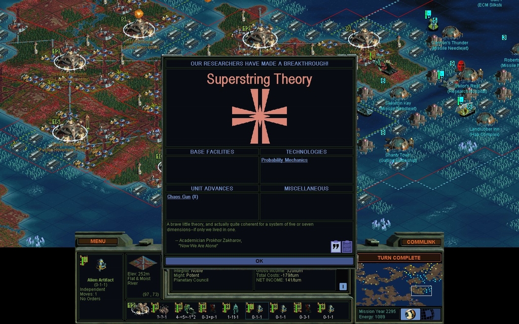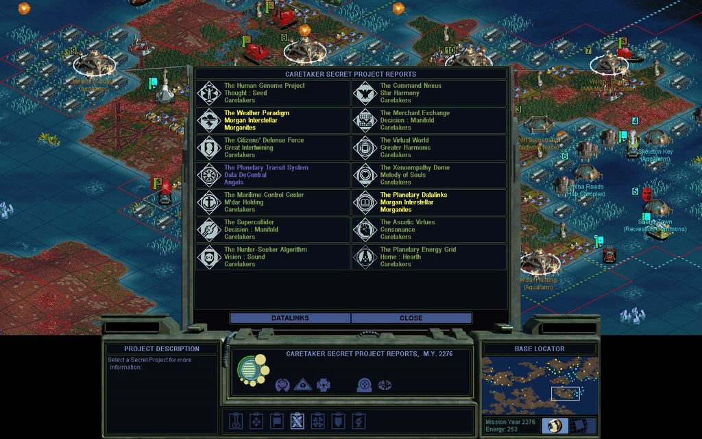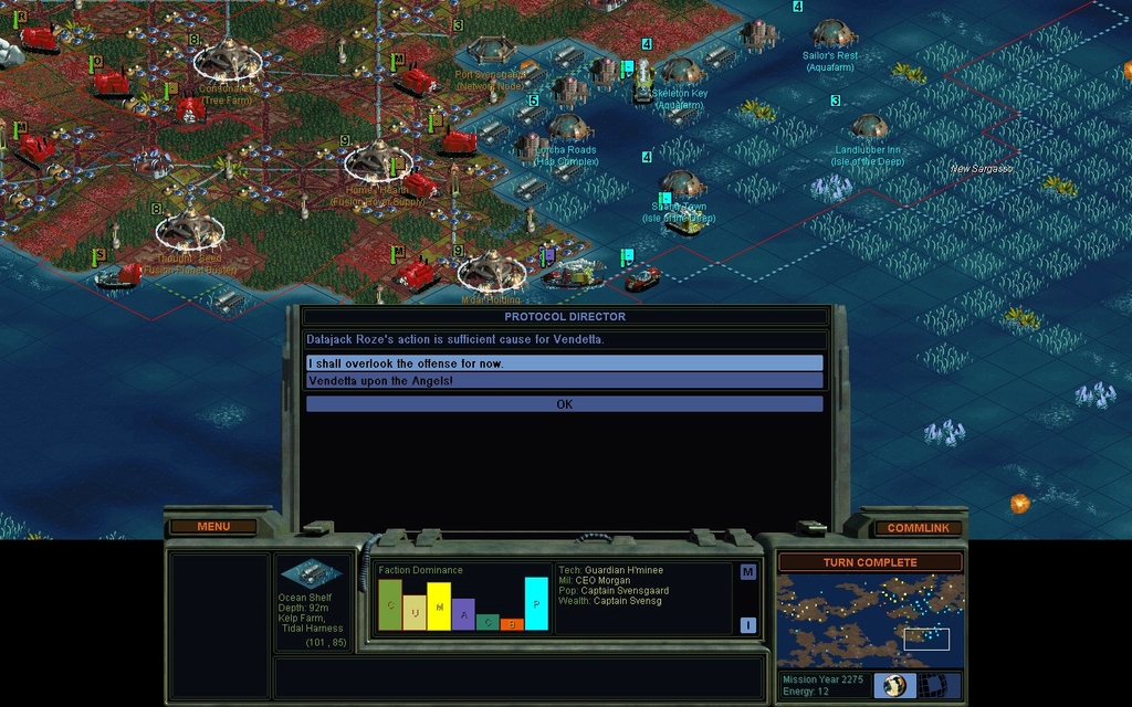 MY 2283.  I decide to fight like a Caretaker instead of count coins like a Morganite.  Surprisingly, going Green only costs me 3 credits per year.  -1 energy at HQ is not a big deal.  I might have liked to grow, but I'll be growing plenty by conquering Usurper bases.  That's part of the point: they won't depopulate the way human bases do.  This will extend my Alien Energy Grid, what we Aliens get instead of Commerce.  Even if those cities don't do anything else, it should make me a lot of money to have so many of them.
