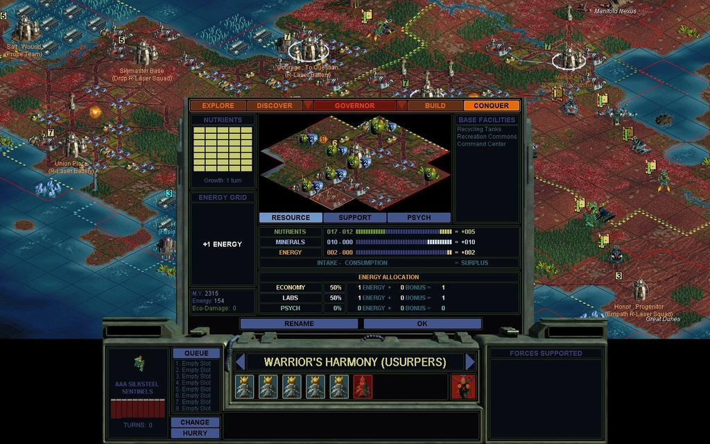 MY 2309.  I complete the Cloning Vats, thereby increasing my industry, efficiency, and credits per turn.  I consider changing to a Planned economy but decide against it.  It would not matter to my ECONOMY, but my EFFICIENCY is currently +1 and it would drop to -1.  I am expecting quite a bit of unhappiness in the near future due to the permanent population boom, and I don't need Bureaucracy adding to the problems.  Nor am I going to choose anything which lowers my +3 POLICE rating, as single Police Scouts are proving to be extremely useful as garrisons.  Their 4X enforcement power brings distant conquests under control quickly, just building them on-site.  They get attacked by planes and missiles, but then I just build them again!  As such, they are good distractions in the absence of real industry.  I have not bothered with any kind of factories in this game at all.  Why risk the eco-damage when I'm meeting my goals?