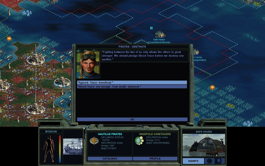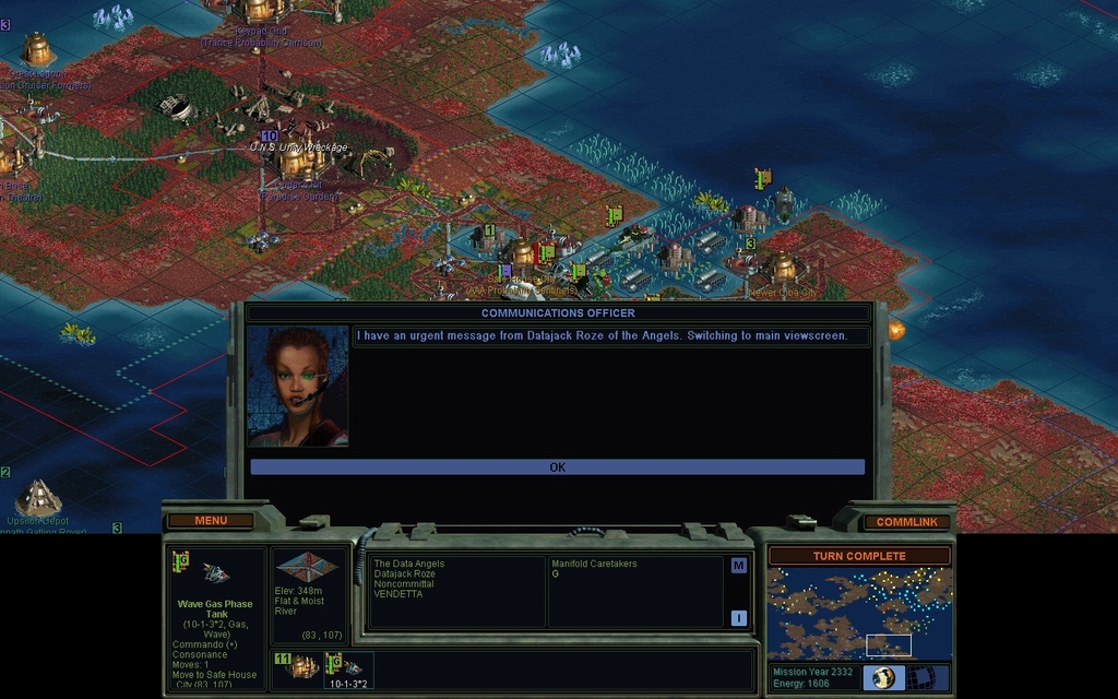 MY 2331.  I keep having to play this turn over and over again, because a bug keeps causing Morgan to declare Vendetta on me after he's agreed to a Truce.  Then the Pirates join in, further ruining what I've been carefully working towards.  Something is wrong with the way probe teams take over a base.  Perhaps because the humans escape in sea pods, triggering immediate conversation before other game variables are updated?