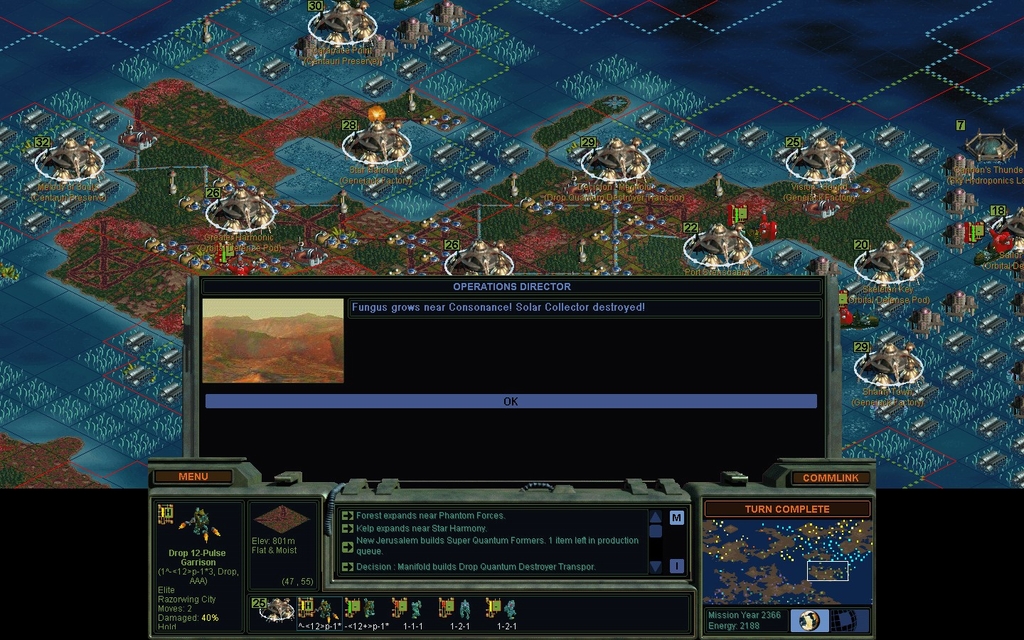 The fungal pop occurred at the base where I built the Bulk Matter Transmitter.  Luckily this base happened to have some ancient Synthmetal Sentinel units in it, which did a good job of blowing away the mindworms that completely surrounded the base.  I still had to bring in a drop unit to clear an adjacent stack, and 1 mindworm remains at a distance.  It's hard to see them as I have a shortage of both Sensor Arrays and planes.  The base didn't look like it was doing eco-damage, but that's because the mindworms were covering a lot of squares.  Once they were cleared, it did 32 eco-damage, so I'm building a Centauri Preserve.  The same is true in perhaps 10 bases in my empire.