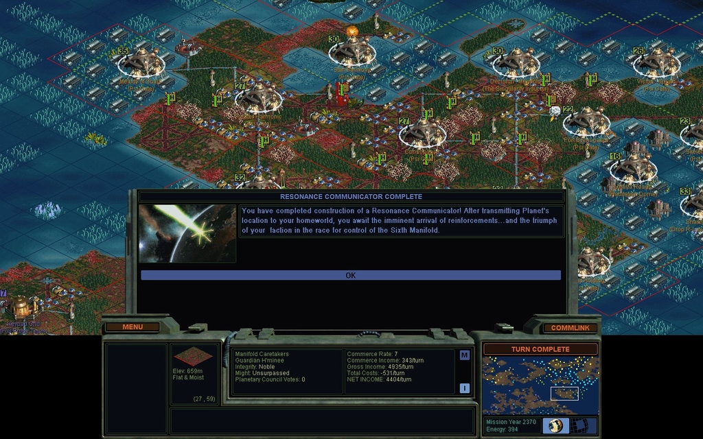 I have a sinking feeling that somehow, this is not over.  What if it's like an Economic Victory and takes 20 turns to win?  The Datalinks don't say one way or the other.  If I don't win next turn, then I'll need to go digging around in alphax.txt or online to find out what's going on.  Meanwhile, I don't need research anymore.  Aside from the last few turns researching the last tech, I just fished an Artifact out of the water.  Next turn it'll be back to base and I'll cash it for my last tech.