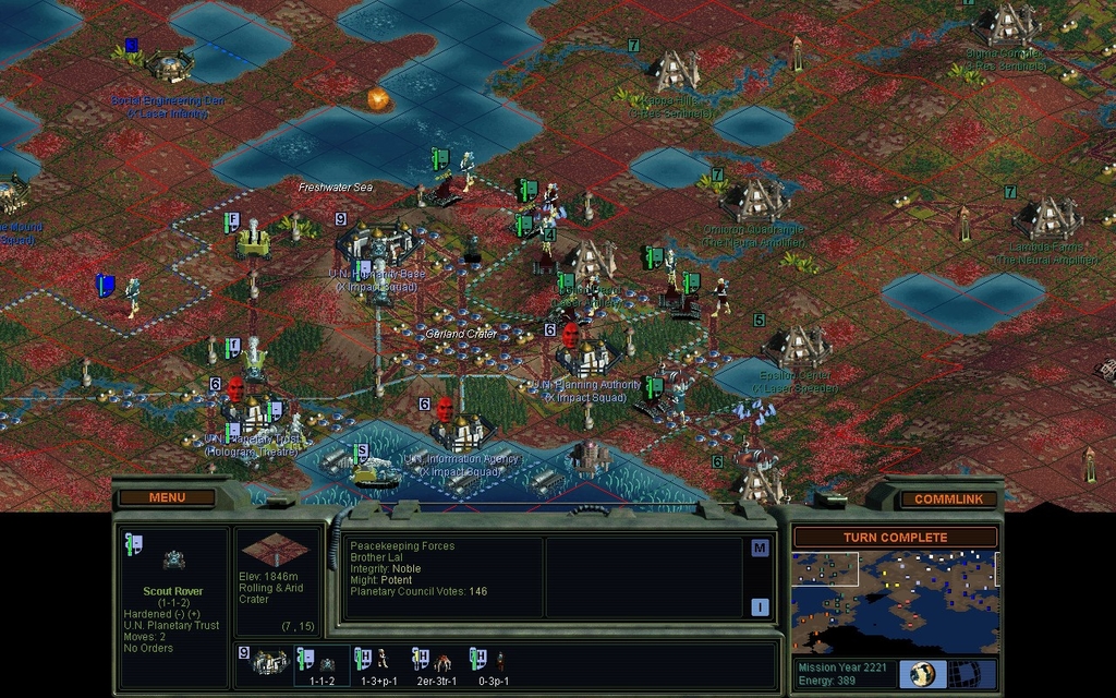 I am building cities around my capitol to prevent further encroachment by the University, and to create an economic / research zone of great profit.  The effort will slow down my offensive against the Cyborgs because Formers are needed for both tasks.  Also I have to garrison any new cities with defensive probe teams.