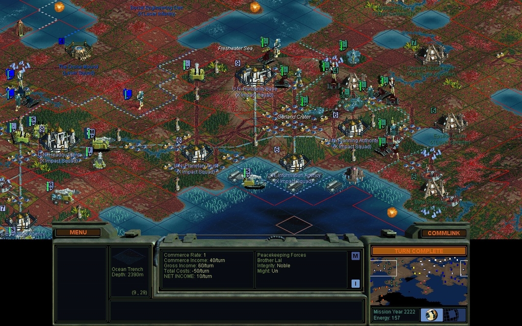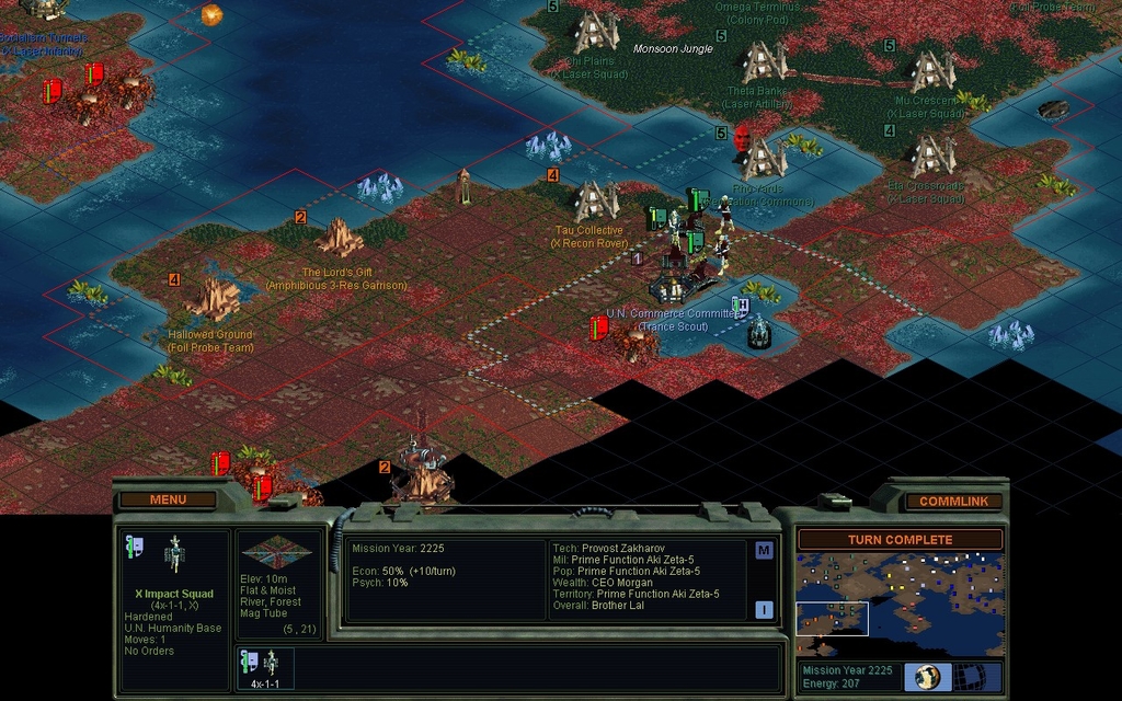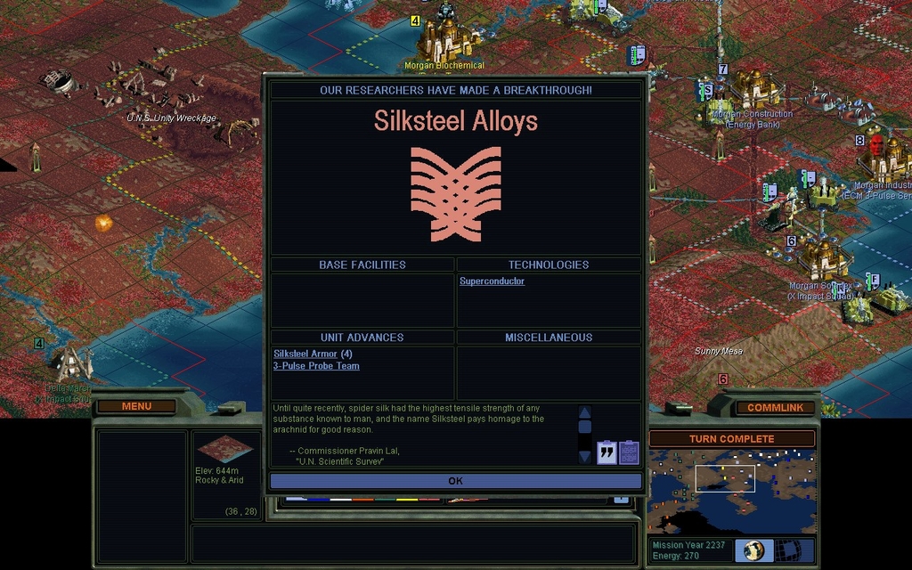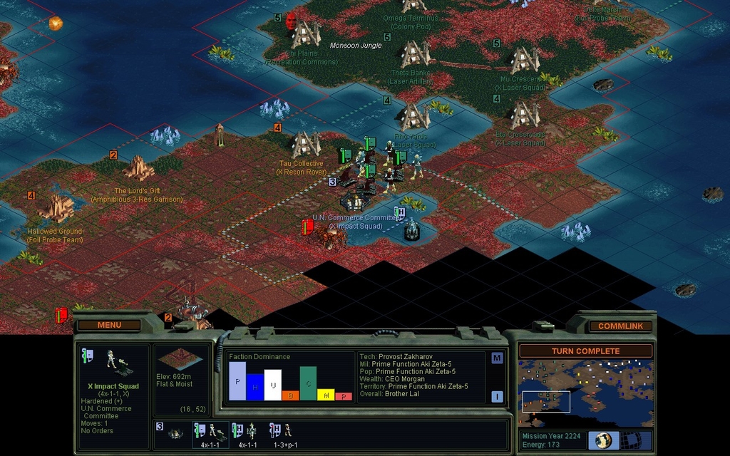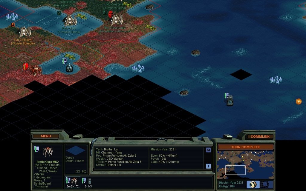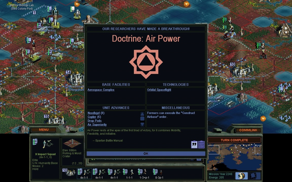 MY 2248.  Just the thing I need to walk all over anyone!  Even if only to provide cover for my advancing Elite 4X-1-1 units.  I suppose an air umbrella doesn't extend indefinitely, so I'll still need some Formers to build air bases.  I could build a Carrier if the Cyborgs weren't so far inland.  Actually I can still do that to their Monsoon Jungle holdings.  Its their original interior which is completely landlocked.  The most immediate relief will be wiping out anything approaching Morganic territory.