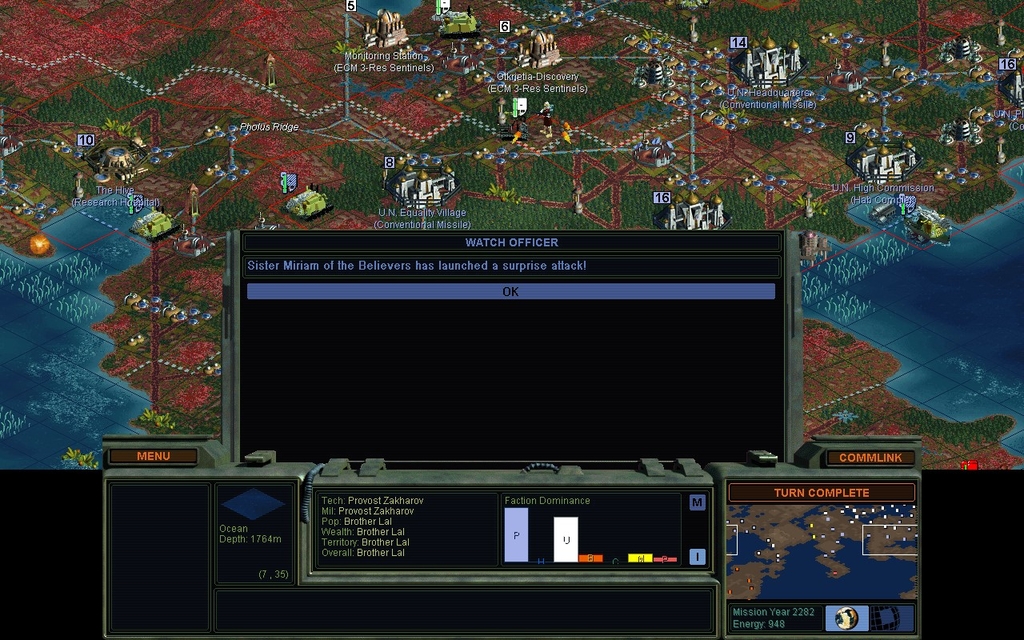 Miriam made one of the dreaded Synthmetal Probe Teams.  I wonder why it didn't do anything?  Maybe not enough money to bribe?  Only recently did I learn that one's energy credit balance affects the cost of probe team actions.  However I'm really far away from my capitol, so prices should be in her favor.  Maybe she just didn't have enough movement?  In any event, it dies now.