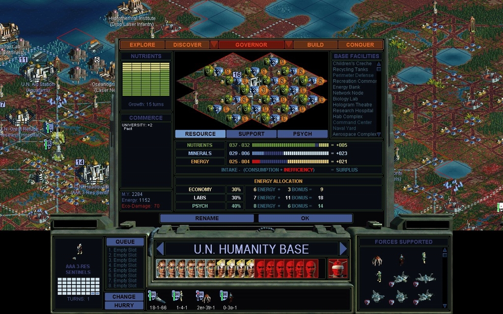 MY 2277.  War averted.  I have a new terraforming tactic for this stage of the game!  Ordinarily by now, I'd have all these forests and food and minerals and mines and stuff.  This time I don't.  So instead of building mines on rocky outcroppings, I'm building Condensers.  When they are near a sufficient number of farms, of course.  This way I can get various bases closer to size 16 without needing Advanced Ecological Engineering.  Which I would have long since had by now, if I hadn't been doing this Planned continual warfare thing.