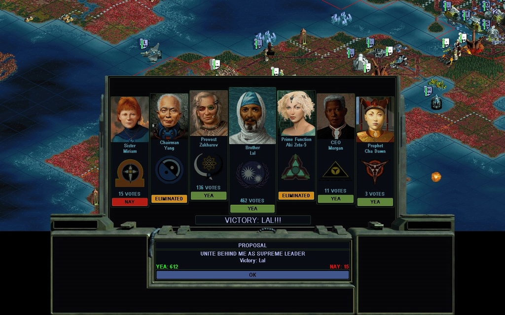 Now to see what Miriam wants to do.  I am only a few votes shy of Supreme Leader.  Those "wet rock" terraforming tactics are actually directly helpful to my cause now.  Zhakarov's population hasn't changed much; he's not into growth the way I am.