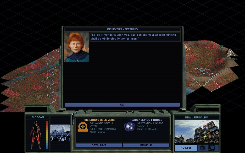 Definitely a much better neighbor than the Believers.  She won't ally or trade techs though.  She's probably ahead of me, with her +1 RESEARCH bonus.  She didn't claim to know any other comm frequencies either.