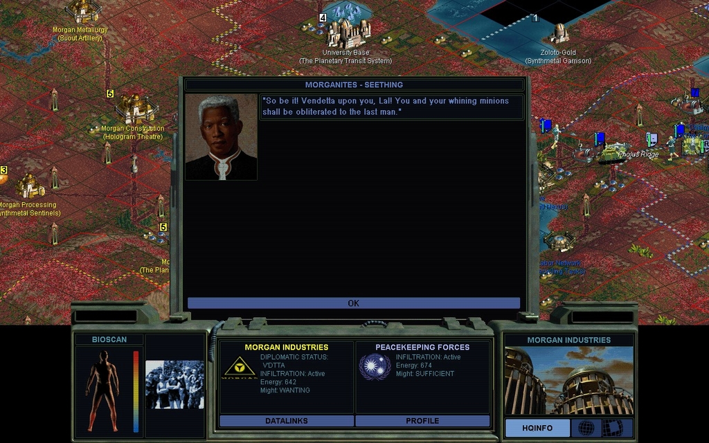 MY 2187.  As I line up 2 Scouts and a Laser Rover against the first Morganic city, he wants to talk.  His talk doesn't include surrender, so next year that city dies.  I don't have that many proper offensive forces yet, but I've sent all my various extra peons in his direction.  The one thing I'm really lacking is probe teams.