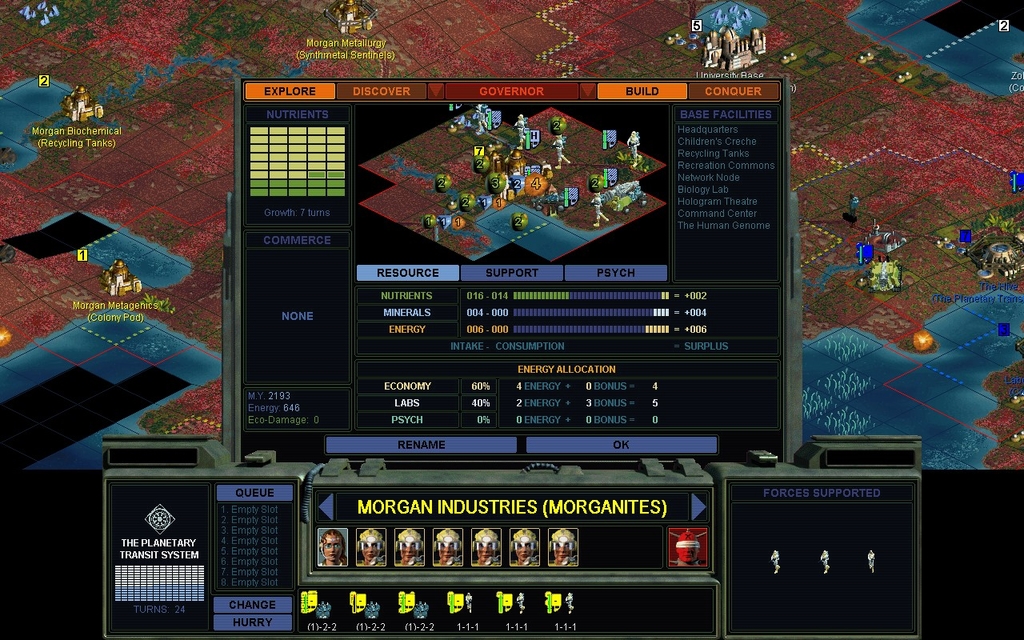 MY 2193.  I've got Morgan Industries mostly surrounded with Scouts, that Morgan is not actually doing anything about.  He's holed up with 3 weak armored artillery pieces though.  The armor doesn't help in an artillery duel, but it does help against other troops attacking the city.  I am bringing up more powerful artillery to kill them.  I've also got 3-Pulse and ECM capability now, that I don't even need against Morgan.  I will just build those for a strong defense and send even more peons to the front to deal with him.
