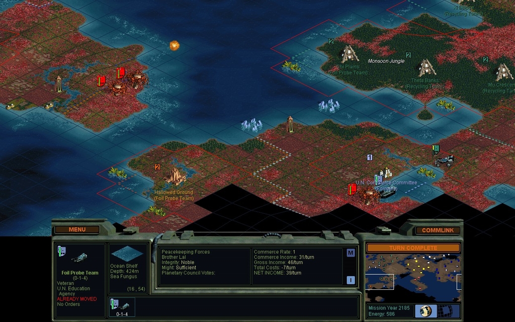 MY 2187.  As I line up 2 Scouts and a Laser Rover against the first Morganic city, he wants to talk.  His talk doesn't include surrender, so next year that city dies.  I don't have that many proper offensive forces yet, but I've sent all my various extra peons in his direction.  The one thing I'm really lacking is probe teams.