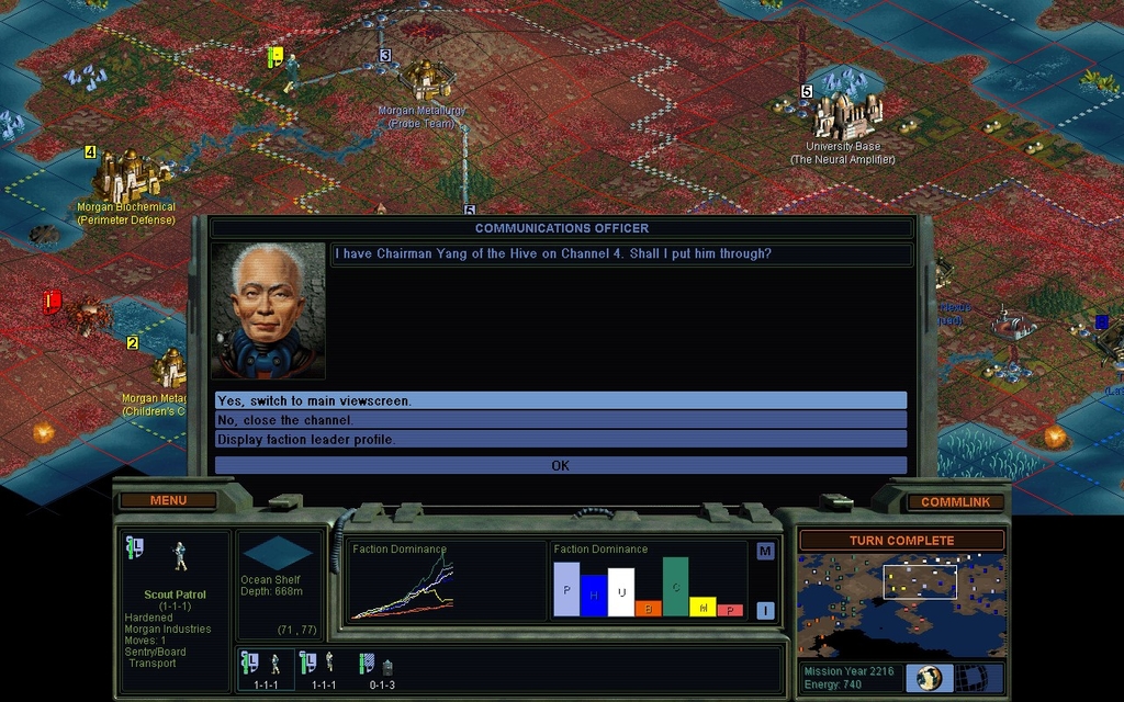MY 2198.  My artillery didn't even scratch his Synthmetal defender behind a wall.  One of my Laser Rovers summarily died attacking.  Meanwhile my allies the Cyborgs and the Hive have gone to war this year.  I am feeling a lot less guilty about using the armored probe team trick!  I've got fantastic defense and screening troops, but no offense.  I tried to contact Morgan for a Truce but he's not talking.  So, my Scouts are tearing up his countryside.  Worst case, I wait for Particle Impactors and make them chemical, so that they will attack with strength 6.  That might be the case against either ally as well.  Best if I just have them fight and I stay neutral for awhile.