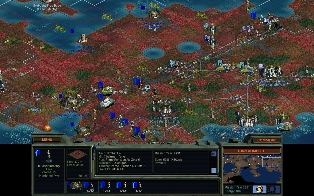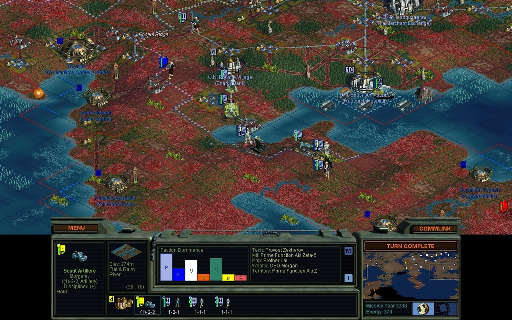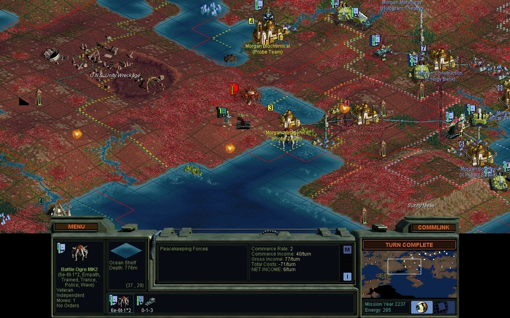 MY 2248.  Just the thing I need to walk all over anyone!  Even if only to provide cover for my advancing Elite 4X-1-1 units.  I suppose an air umbrella doesn't extend indefinitely, so I'll still need some Formers to build air bases.  I could build a Carrier if the Cyborgs weren't so far inland.  Actually I can still do that to their Monsoon Jungle holdings.  Its their original interior which is completely landlocked.  The most immediate relief will be wiping out anything approaching Morganic territory.