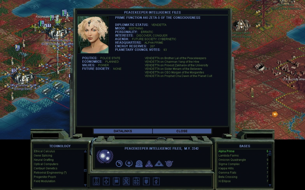 MY 2221.  So far so good.  I predicted she would put a stack of 3 probe teams next to my city, and I shall summarily kill them.  I predicted 1 unit would come next to 1 city, so I only needed to rush 1 unit to kill it.  I didn't predict my pop booming would disrupt my weapons production.  It's not a crisis, but I did lose a turn in 4 cities from that.  I still don't know how to play my own mod.