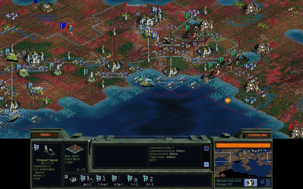 MY 2248.  Just the thing I need to walk all over anyone!  Even if only to provide cover for my advancing Elite 4X-1-1 units.  I suppose an air umbrella doesn't extend indefinitely, so I'll still need some Formers to build air bases.  I could build a Carrier if the Cyborgs weren't so far inland.  Actually I can still do that to their Monsoon Jungle holdings.  Its their original interior which is completely landlocked.  The most immediate relief will be wiping out anything approaching Morganic territory.