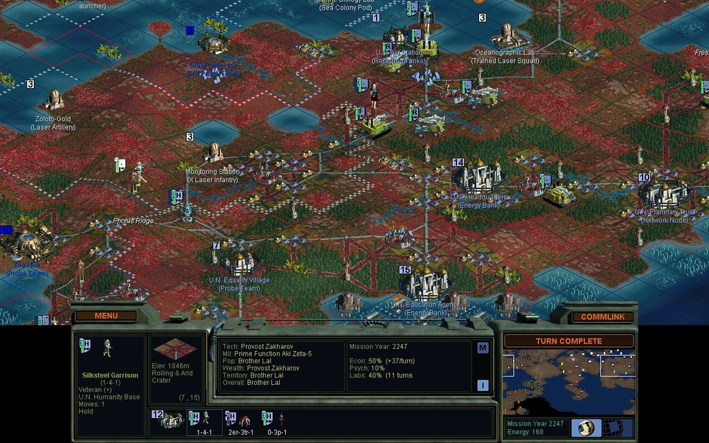 I am building cities around my capitol to prevent further encroachment by the University, and to create an economic / research zone of great profit.  The effort will slow down my offensive against the Cyborgs because Formers are needed for both tasks.  Also I have to garrison any new cities with defensive probe teams.