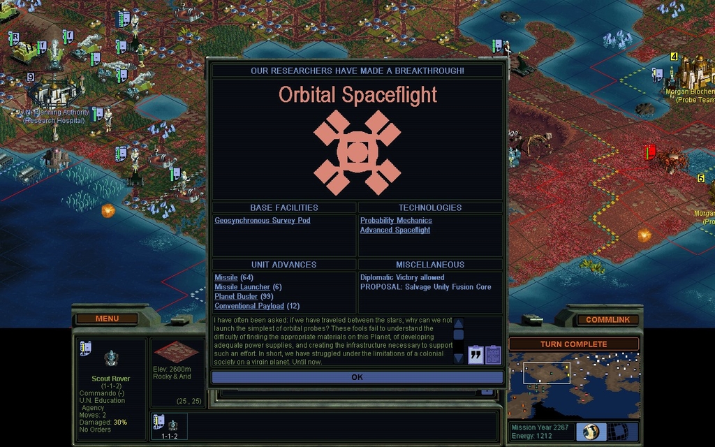 Note the 66 moves remaining.  I can do a 33 distant scouting trip and back with this thing.  That's actually needed at times because I do not allow satellites upon getting Orbital Spaceflight.  With Advanced Spaceflight you can get an Orbital Defense Pod.  That's the 1st satellite that reveals Planet.  The orbital facilities that give you resources come even after that, as I figure they're distant logistical challenges.