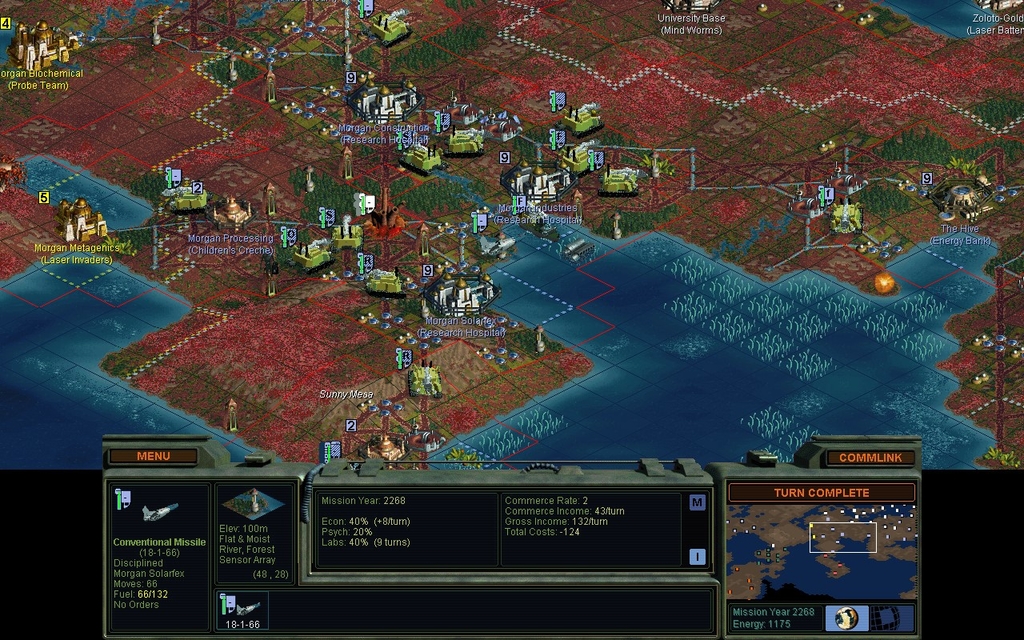Granted, I have been playing a Planned economy this whole time, not something that can make a lot of money for research.  But frankly I don't have the breathing room anyways on such a small map.  I had to fight for a long time, it's only recently that it's become optional.  And I can't very well leave the Cyborgs sitting around.  If I did that long enough, they'd nuke me for all the atrocities I've pulled!  Once you've started down that road with a faction, you have to obliterate them.