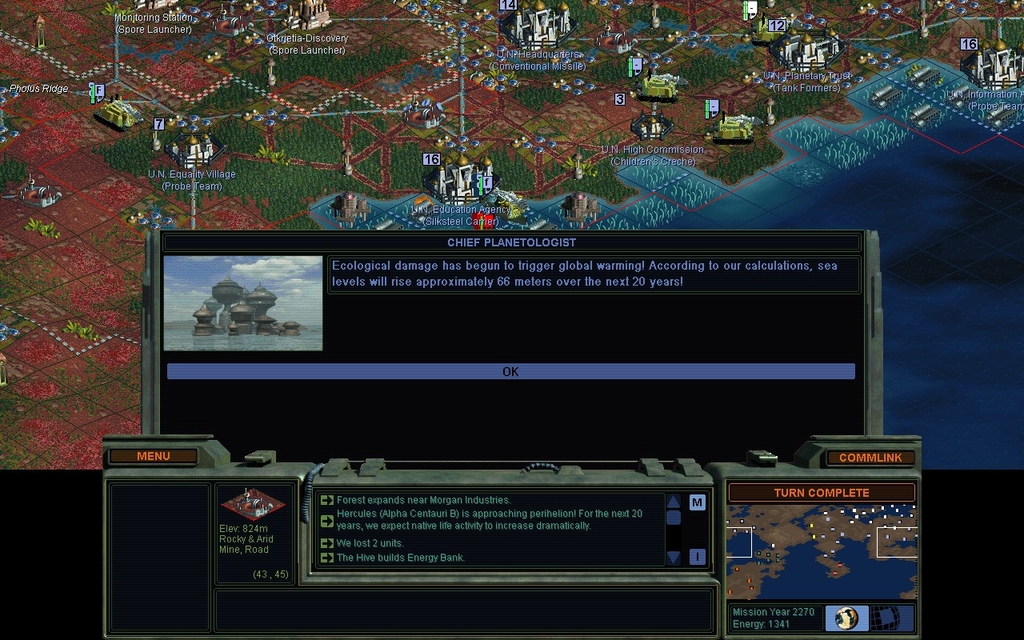 MY 2258.  I've polluted enough to attract Locusts.  My ECM unit of course did not hold up to that.  I will need to make a new kind of garrison.  Meanwhile I'll try to fake it with some high morale stuff.
