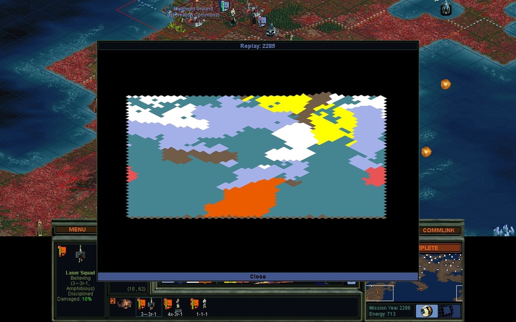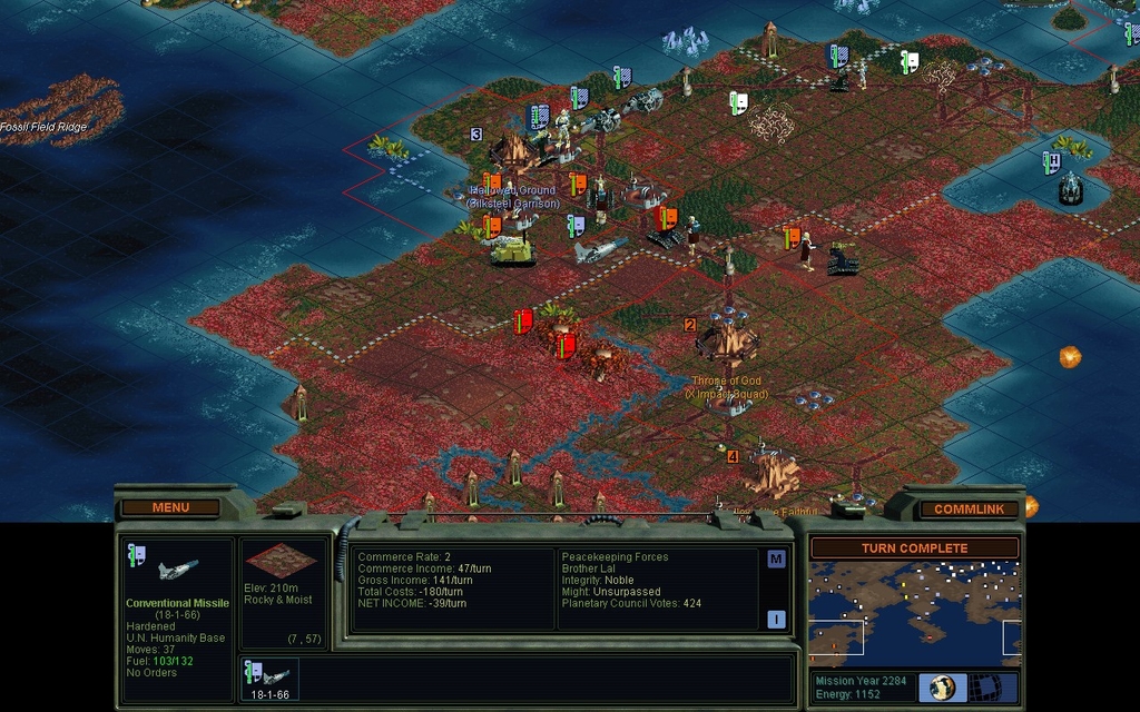 A fairly lavender planet I suppose.  Isn't it startling, that one gets the most peaceful time in the game, by committing the most violence?  Just consider what this would have been like, if I hadn't gotten the Planetary Council's blessing on the chemicals.  Well it would have been a lot of dying in agony and getting nukes in the face, that's what.  This was so tame, that I wonder if I'd bother to do it again.  I thought perhaps the mindworms would come, despite the UN agreement.